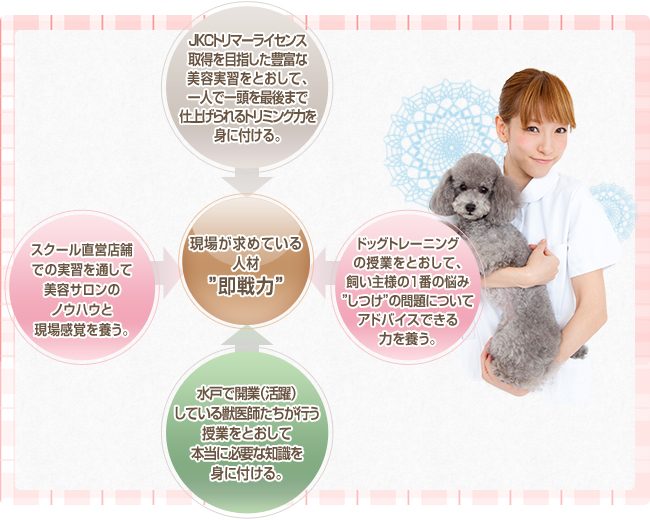 また、37年の経験と実績がある美容サロンが併設されており、現場の生きた情報が手に入る環境があります。現在のペットを取り巻くさまざまな問題などをダイレクトに知る事ができ、またそれを反映した内容を授業に組み入れています。